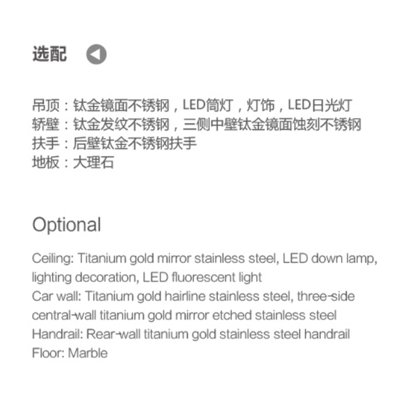 上下罩:钢板烤漆(长罩);观光面:菱形,安全夹胶玻璃;吊 顶:发纹不锈钢;扶 手:不锈钢扶手;地 板:大理石